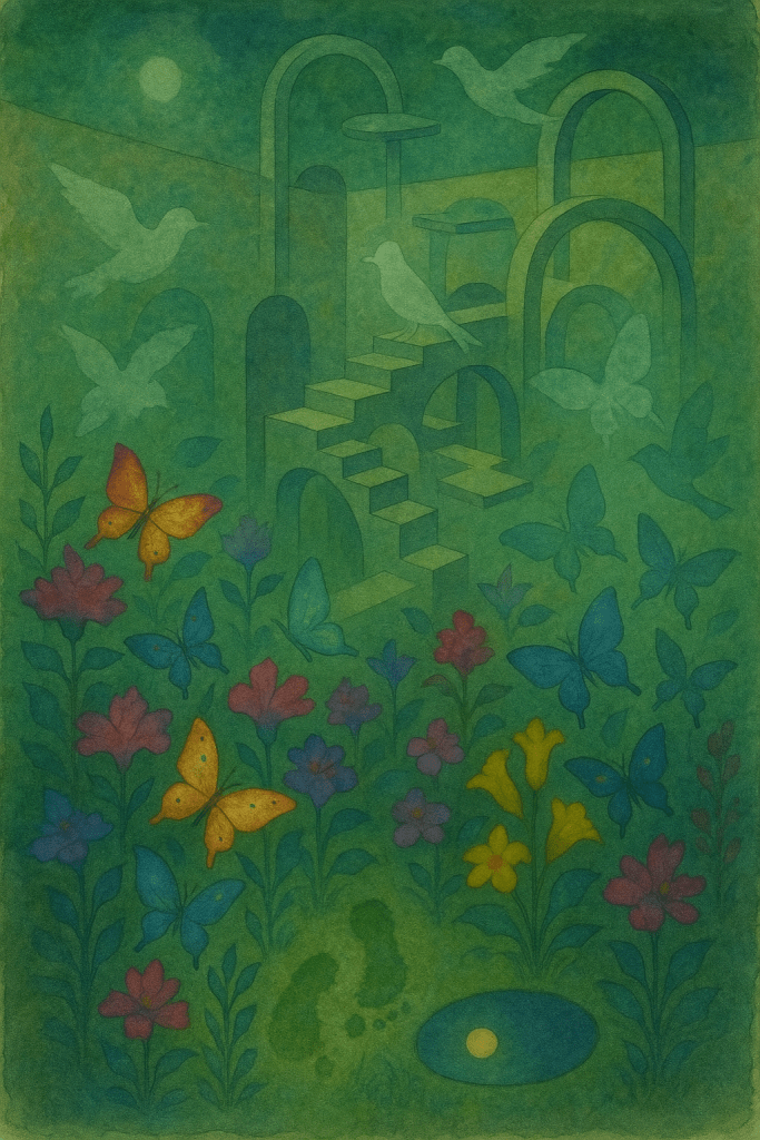 My garden is impossible, like an Escher drawing. A high wall stands on its perimeter, yet somehow does not enclose it. As a result, my garden is everywhere. Flowers overgrow railings and doorknobs. Stubbornly they grow out of walls and roads. Running, I have to be careful not to step on them. Birds flock to my shoulders. Some are Kundera’s birds of chance. I cannot count them. Others, seemingly non-accidental, rest after long migrations. I feed them hope. I give away my hope to them! Sometimes I catch them hiding it inside the corollas of daffodils. Hope is hard to get rid of. Hope is like aphids or weeds! (yet without it I am a flame without the light)