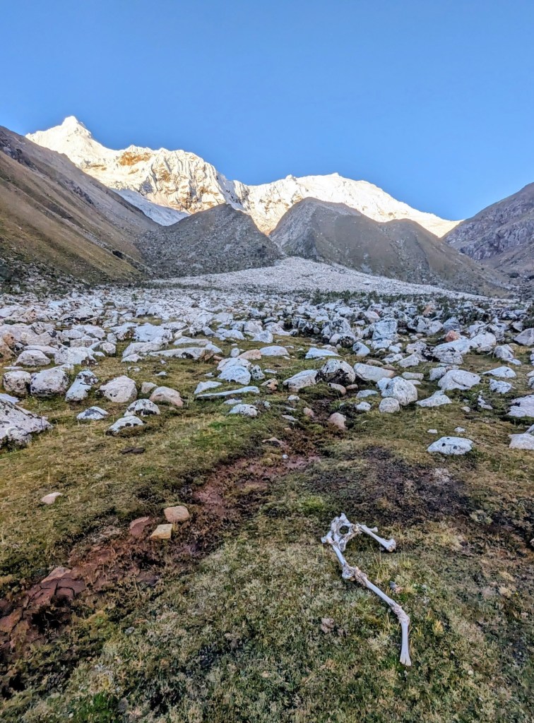 I walk through the shimmer to the Ishinca river. Something skeletal lies among the rocks—same color, almost invisible until its elongated shape gives it away. Legs and pelvis. For an instant, they look human. The shimmer intensifies. The meltwater from the glacier above is unsurprisingly ice cold. Unsurpr-ice-ingly. What else did I expect? A few days ago, as we were hiking to the base camp, the river lured us with the promise of respite from equatorial heat. “An American died of pneumonia after jumping into the river last year,” Fredi warned, seeing the same idea in our eyes. Now, after a few cold nights at altitude, swimming seems unimaginable. Then and now. Here and there. Parsing syllables and knots. It’s all relative.